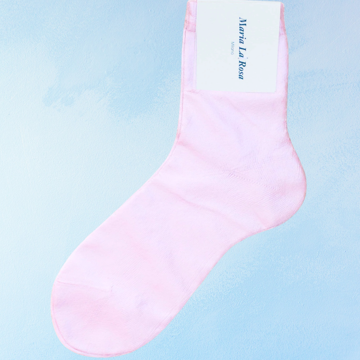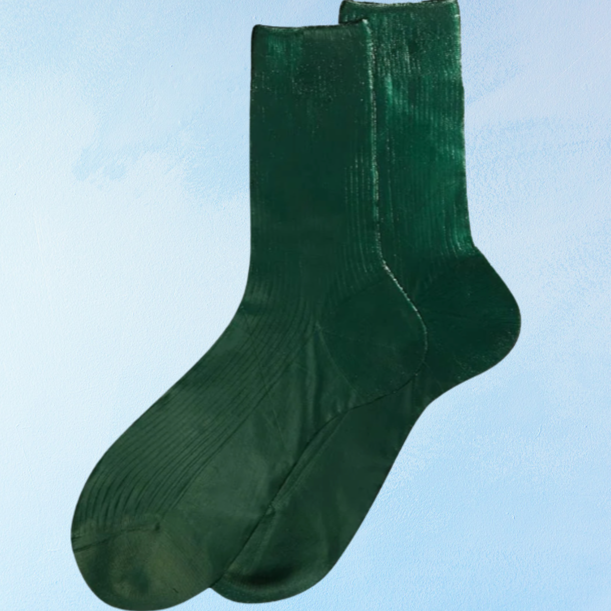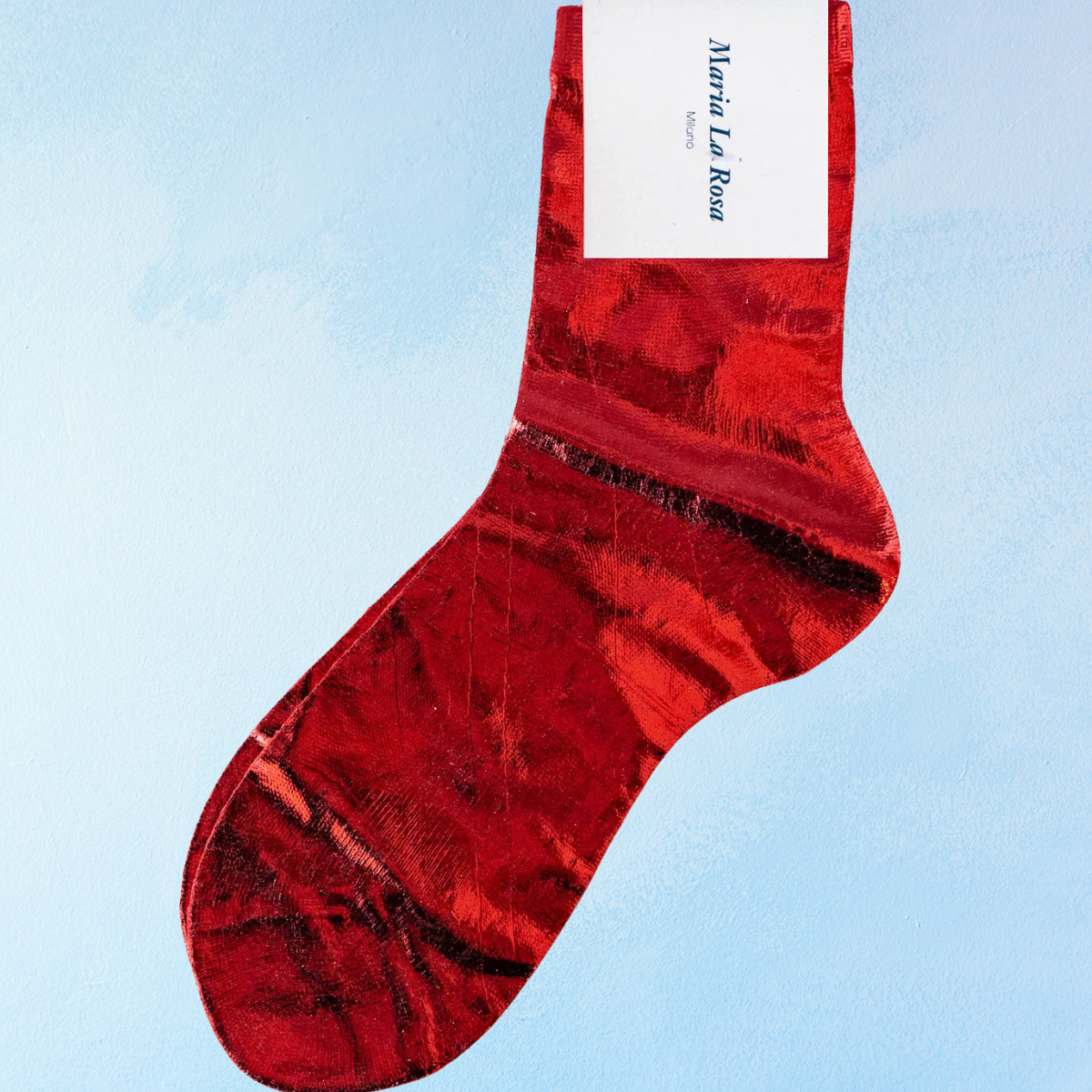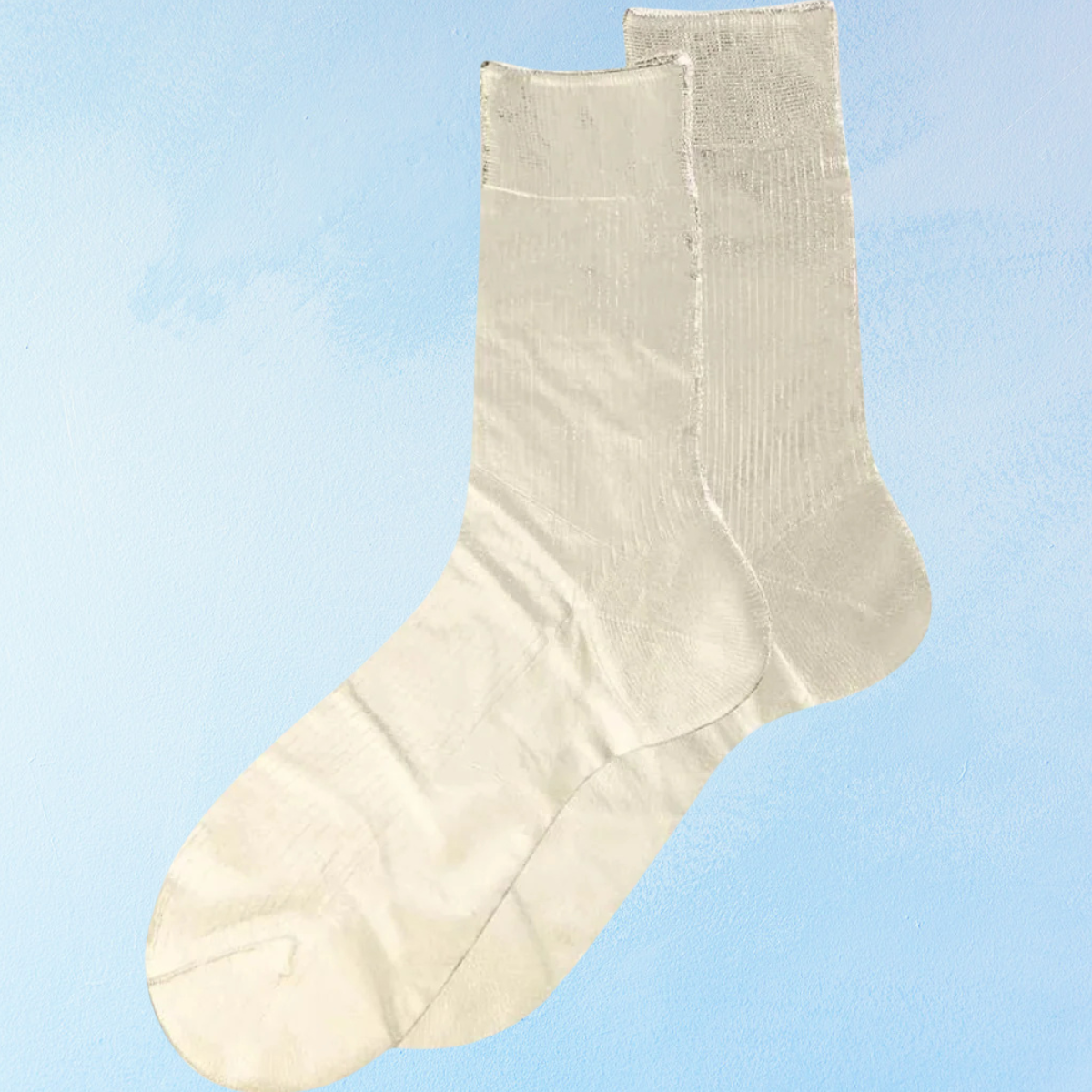 Women's laminated socks, made with precious silk yarn, ideal for all seasons. The material with which they are made, in fact, despite its thinness, is extraordinarily insulating, making it very cool in summer and warm in winter. The sock was subsequently covered with a metallic finish, which, after multiple washes, tends to disappear, letting the brilliance of the underlying silk emerge.