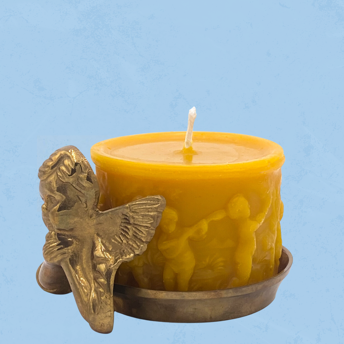 The embossed candle. Wreathed with scenes of the childlike state of peace and leisure, the Mirth Pillar beholds the goodwill of a light heart. This candle mold was created in-house by replicating an antique.