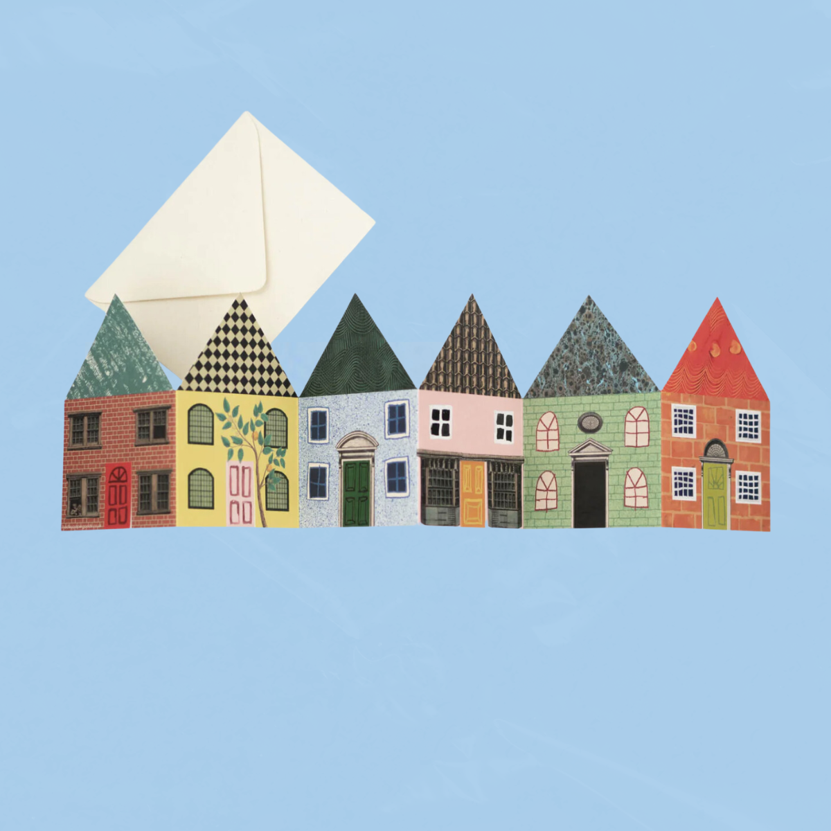 Concertina style cards offer a unique design, perfect for displaying on a mantel, shelf, or anywhere else you'd like to show them off. Folds out to reveal six home facades, each with their own story. Even the doors fold open! Congratulate a friend on their new home, welcome a new neighbour, or send a subtle message to a homebody in your life.