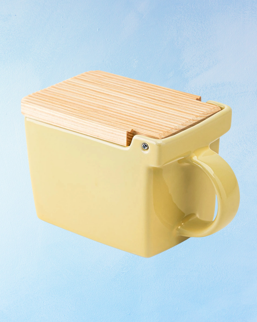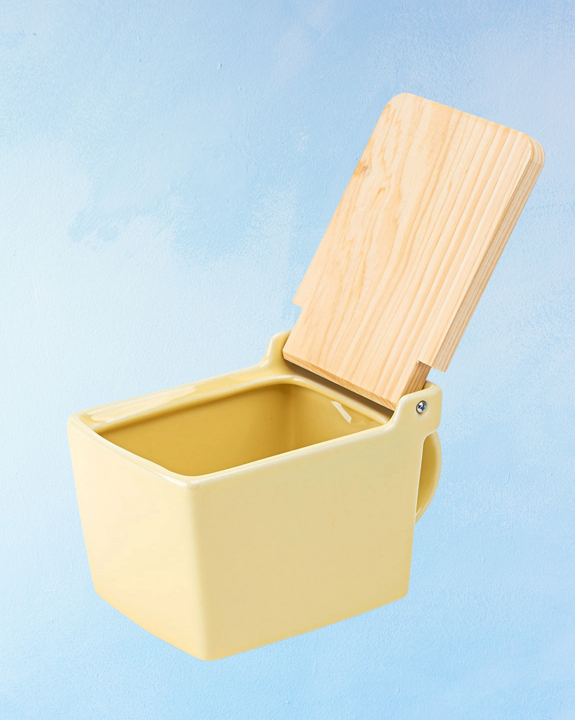 Store your salt close at hand with this ceramic salt cellar box. The hinoki wood lid keeps salt protected from moisture and debris. Designed with a flip lid which simplifies opening and refilling while the handle makes maneuvering around the kitchen a breeze. Holds up to 2 cups of salt!